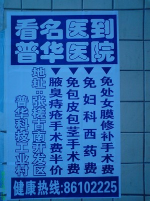 之前在工廠旁看到一個醫院廣告, 寫著, 包皮環狀切割手術30元… 還在質疑, 30元的手術誰敢去做的時候~ 現在出了一個免手術費的醫院… 免處女膜修補和包皮手術全免手術費… 是因為拿割掉的包皮補處女膜嗎? 噁… 有點反胃了起來