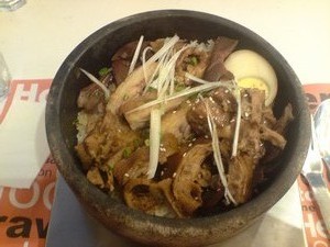 只見每個人奮力拌著鍋中飯菜, 深怕產生鍋粑… 想不透的是, 不管是台式的滷肉飯、泰式餐點還是我面前這不知哪國的滷鴨飯, 清一色石鍋的用意到底為何啊?