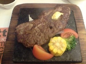 果不其然, 牛排雖不是用石鍋上的, 但也是用了火燙的石板啊!(一塊牛油在牛排上面的用意是?) 一切開, 是全熟的… 和一般正常大陸西餐中的牛排一樣, 不管是什麼牛肉, 吃起來都是一樣的味道, 這對我一點都不感意外啊~