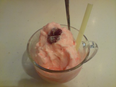 滷鴨都是骨頭, 牛排只是塊狀牛肉… 意思意思吃完後, 點了個草莓奶昔, 珍惜那上面兩顆難能可貴的罐頭草莓~