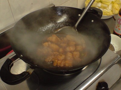 將蒜瓣及薑爆香後, 放入切塊五花肉, 將肉塊煎到表面熟透後, 加入醬油膏及水悶煮… 過程到一半後加入米酒及白糖~ 繼續悶煮讓醬汁入味… 最後大火收汁即可