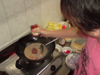 將蒜、洋蔥、紅辣椒爆香, 再放入玉米絞肉炒至肉變白色, 倒入辣椒醬(倒多少就看個人口味)加少許水拌煮後, 即可放下粉絲(一定要先泡過水)… 接下來則是不斷的翻炒~