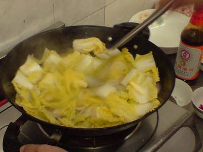 蒜及洋蔥爆香後(乾蝦米應該一起的), 加入白菜後和少許的水翻炒即可… 再加入少許的米酒非常香啊~