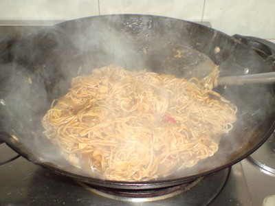 蒜和紅辣椒爆香後, 加入肉絲拌炒至肉絲變色, 加少許醬油和比醬油量多一點的醬油膏~ 放入麵條後再加水翻炒(因為沒有油麵, 普通麵條則需要水來當作媒介加熱) 起鍋前再加入黑胡椒翻炒一遍~ 即大功告成!
