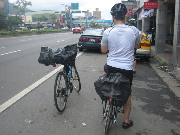 行李看起來沒有很多, 可是加總起來, 沒有九公斤可能也有八公斤… 單手扶起單車還嫌吃重…