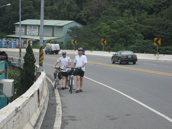 便在中興橋旁找到人行上橋的地方~ 只是, 大家單車背負著沈重的負擔… 最後, 只能依循