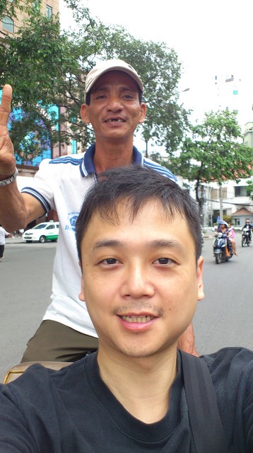 越南的交通相當之亂, 上一篇已經提過, 沒有三兩三, 千萬不要嘗試在胡志明開車, 雖然今天星期天, 車子少了些, 但他踩著三輪車, 比摩托車還橫衝直撞
