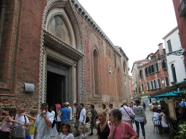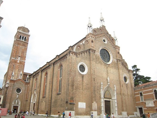 走著走著就來到了聖方濟會榮耀聖母教堂大教堂, Basilica di Santa Maria Gloriosadei Frari~ 陽光強烈的讓這張照片看起來曝光過度, 可是強烈陽光的背後也慢慢見到了烏雲