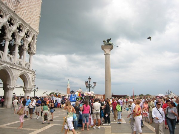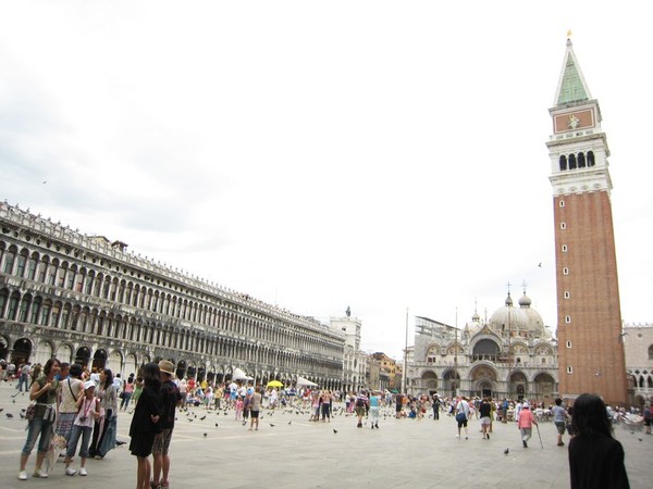 照指標的路線, 我們花了不到一個半小時就找到了聖馬可廣場… 明明已經開始烏雲, 但是光線依舊強烈的讓照片小曝光… 後方的聖馬可教堂不出意外的又在維修了~