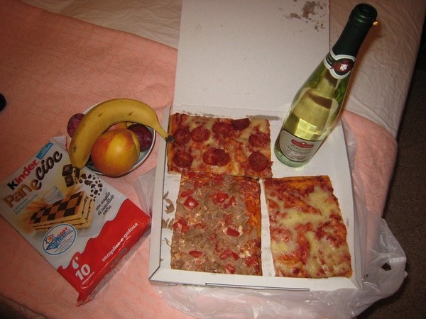 三片PIZZA加上今天去超市買的水果和另一瓶白酒… 17歐就讓我們吃得很開心~ 那個PIZZA比意料中的好吃… 讓我們後悔沒多買兩片~ 吃起來像鹽水雞一樣ㄕㄨㄚ嘴…